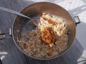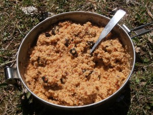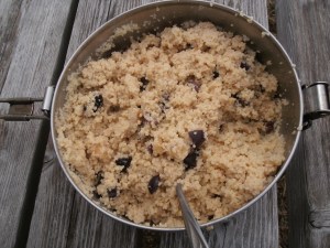 I sometimes carry dehydrated bean mush, which also rehydrates readily, and will mix it with the couscous for more flavor and protein and fat and whatever. There are also prunes in here, this was tasty.