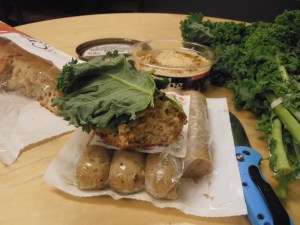 This rainy windy day I stopped at a grocery store and consumed a small bread, a tub of hummus and half a bunch of kale. Perhaps not surprisingly those fake sausage things weren’t that great out of the package, but they held up pretty well stuffed in my bag for a week or so till I cooked them while staying with a friend. (some fake sausage things are fine out of package, though it is not a thing I am in the habit of purchasing)