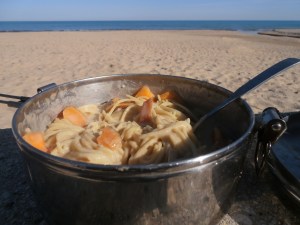 I eat a lot of couscous, which doesn’t need to be heated, it just soaks up water when presented with it and becomes edible. Adding prunes, olives, walnuts, and salt helps too. A pot of food is two or three meals.