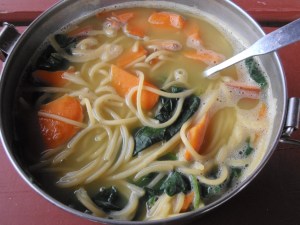 If I’ve got greens I’ll put them in. They don’t travel well, but aren’t so hard to come by and I should really get them more often. This noodle soup contains sweet potato, spinach, nutritional yeast, water and salt.