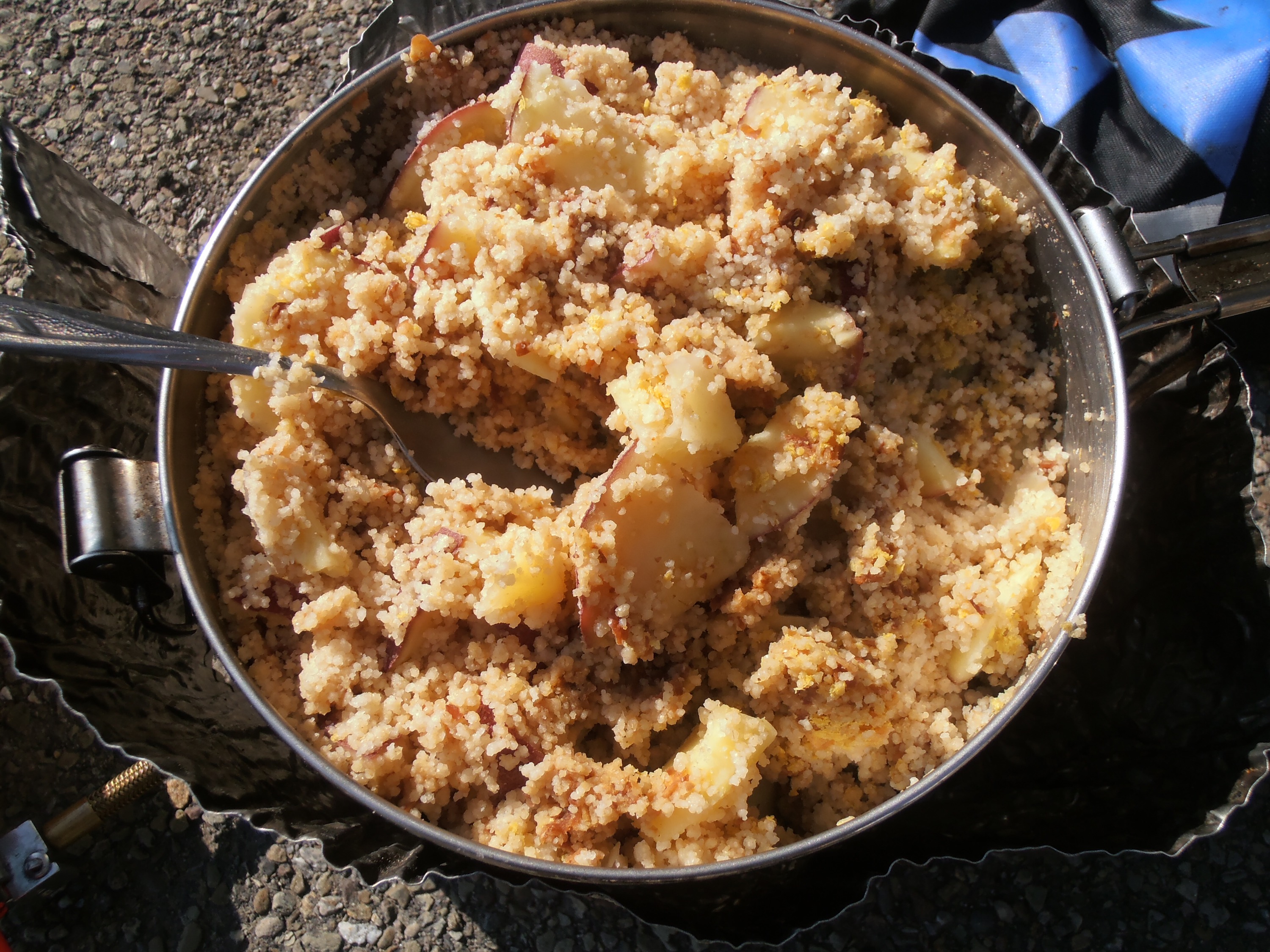 I sometimes carry dehydrated bean mush, which also rehydrates readily, and will mix it with the couscous for more flavor and protein and fat and whatever. There are also prunes in here, this was tasty.
