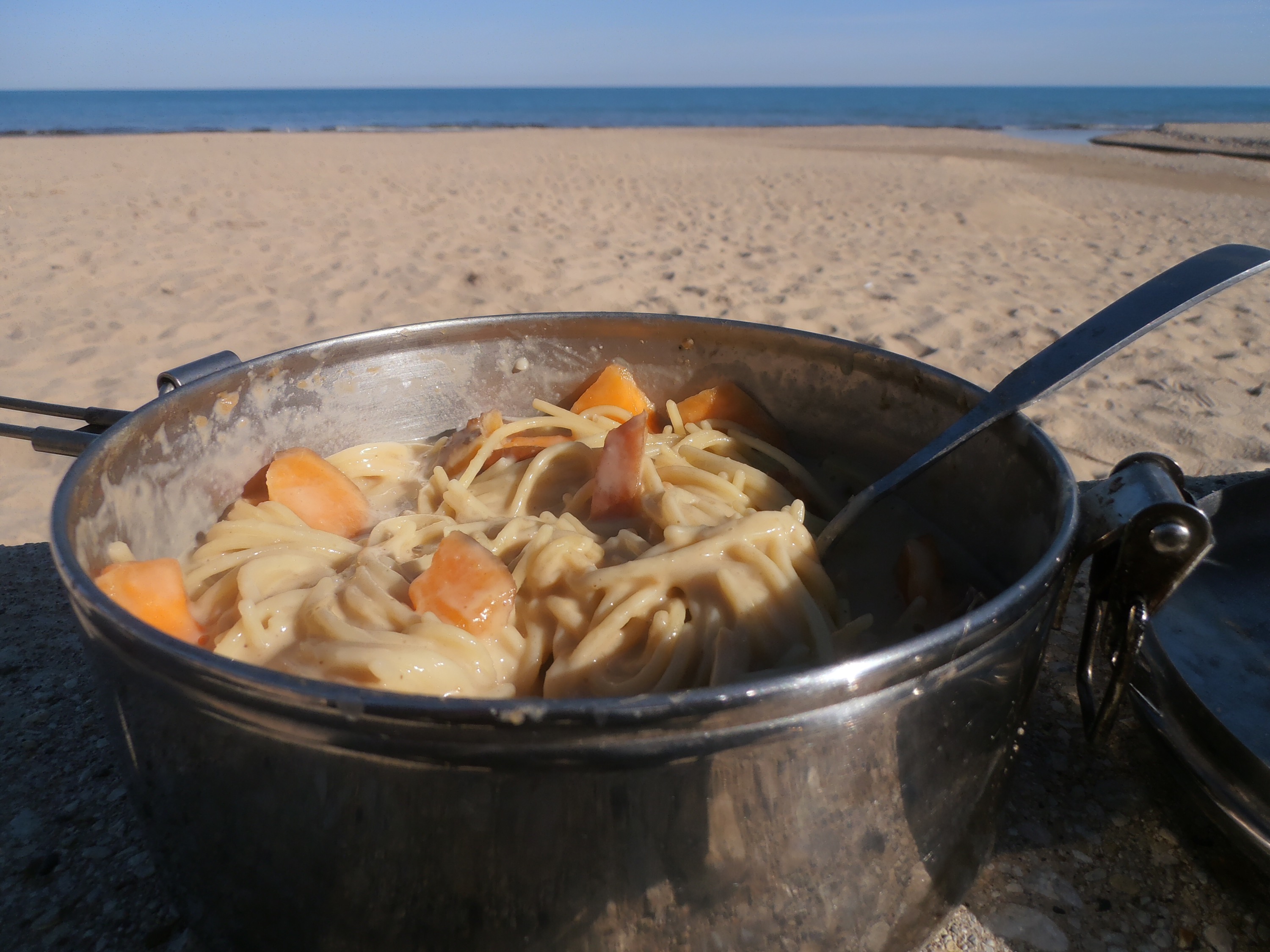 Spaghetti can be had from most gas station/convenience stores. I (always so far) cook it with sweet potato, I find they need about the same time, and don’t drain the water. Here I added peanut butter and salt and it got saucy and wonderful. Think of it as peanut noodles, it isn’t that weird, I promise