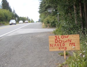 Cooper Landing is very certain they want you to drive 35MPH. It is hard to see but in addition to the three vertical signs, it is also written on the road.