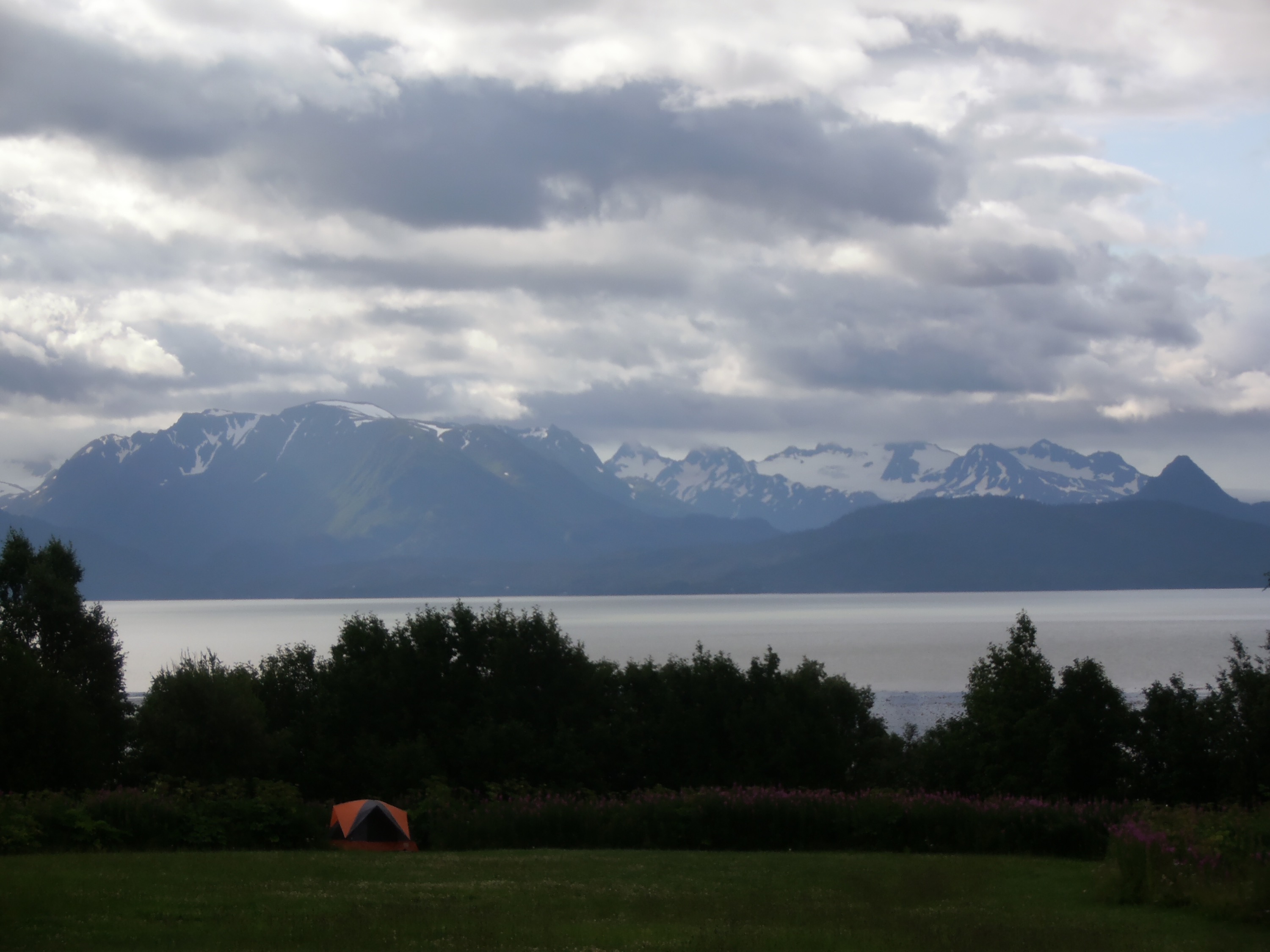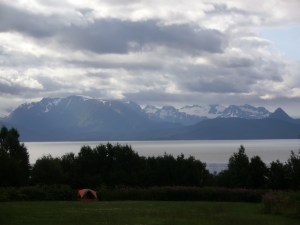In Homer I stayed at Seaside Farm, a sweet little farm that offers (in addition bed type options) camping in the meadow for cheap. Naomi recommended this place as having the best view from an outhouse (this is that view on a cloudy day)
