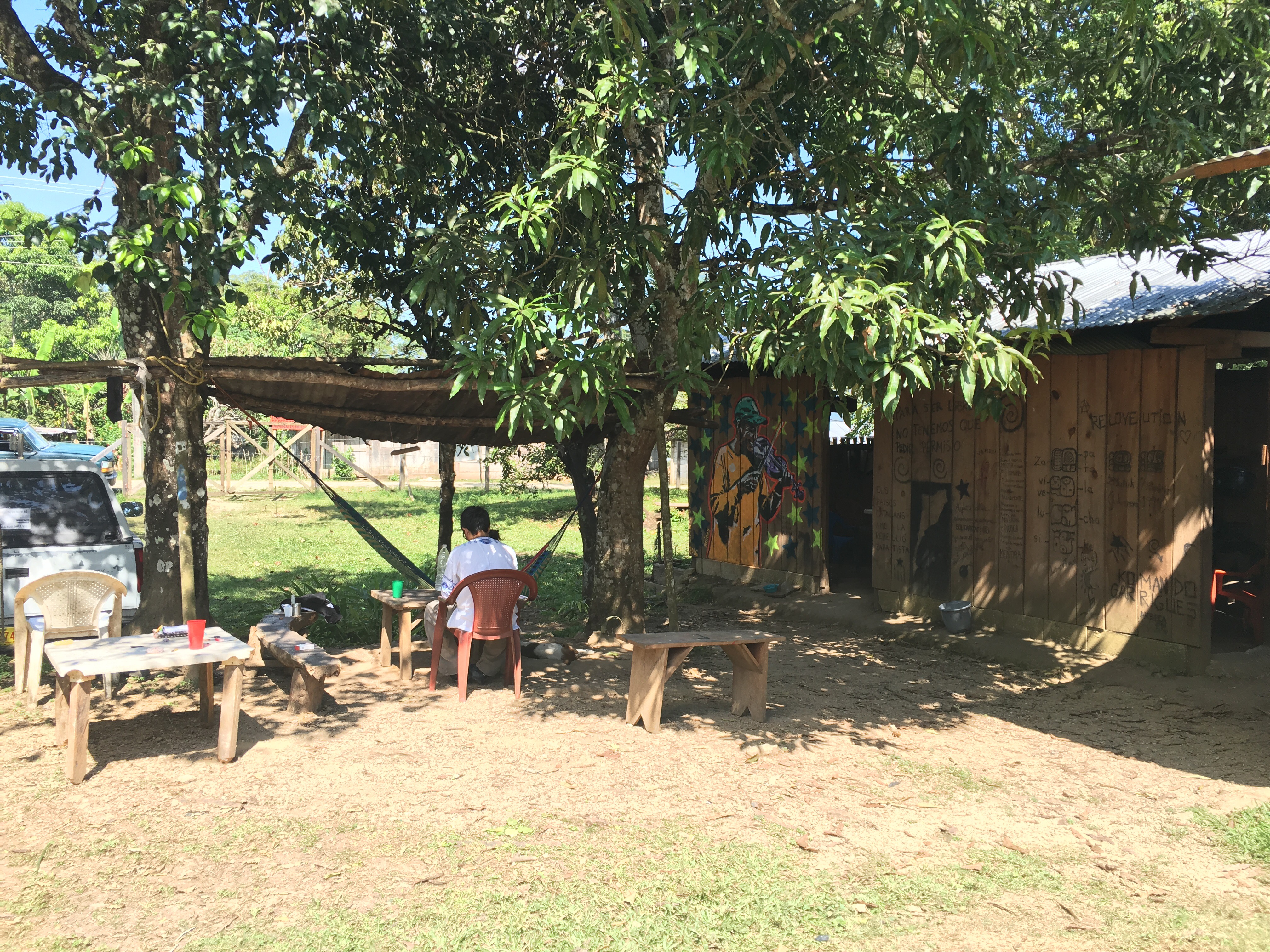 I spent a week in the peace camp in La Realidad-hanging out with Albert (who has the outside enough perspective to see how much drier and less consistent the weather is than when he was there before, just 12 years ago) and the other observers, and the folks from the community that come by sometimes. I also read a lot. There is a good deal of tension in this town. About two thirds of the families are no longer Zapatistas, now part of CIOAC, a state created network of Chiapas indigenous workers. Almost two years ago some folks destroyed the autonomous clinic and school, and assassinated the teacher. The CIOAC receive some government support and are thus available to be used as a militant tool at their will. It was hard for me to get my head around the switch. There was some communication between sides in town before this, but none since. In the camp I was mostly with other foreigners, but there were women who came every day to bring us tortillas and would stay to talk sometimes, and a couple of men who came by in the evenings to hang out and would tell us stories and answer questions and whatever. One of the women told us that her grandparents are still alive, but are CIOAC and so she hasn’t spoken to them in years even though they still live in the same town. There have been outside observers almost continuously since that last attack- most through Frayba, a human rights organization-to discourage violence and to be able to report anything that may happen.